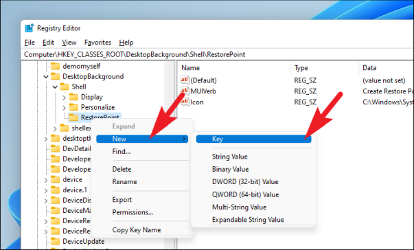 Затем создайте новый подключ, щелкнув правой кнопкой мыши клавишу «Shell», наведя курсор на параметр «New» и выбрав параметр «Key». Затем назовите его RestorePoint.