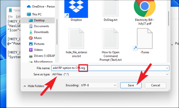 Затем дайте файлу соответствующее имя и добавьте расширение, .regщелкните раскрывающееся меню после параметра «Сохранить как тип» и выберите параметр «Все файлы». Наконец, нажмите «Сохранить», чтобы сохранить файл в желаемом месте.