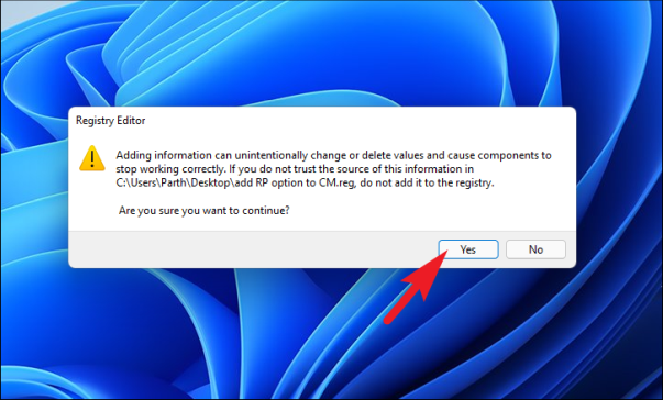 После этого появится запрос, уведомляющий вас о потенциальных опасностях добавления ненадежных файлов в реестр. Внимательно прочтите приглашение и нажмите кнопку «Да», чтобы продолжить.