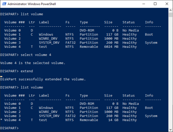 • Введите расширение, чтобы увеличить его до максимально возможного размера. Diskpart подтвердит, работает ли команда extended правильно. Подтвердите, что размер тома увеличился, набрав второй том списка впоследствии.