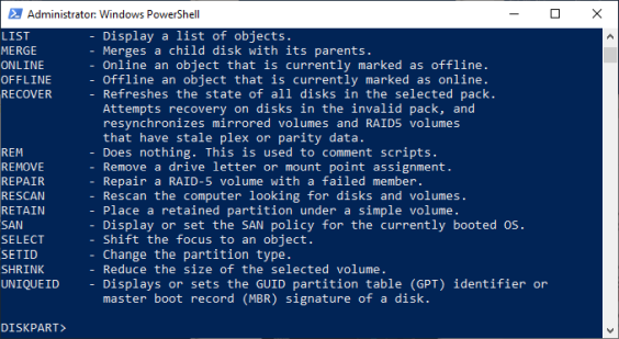 Diskpart имеет другие доступные опции, как кратко объясняет команда help.