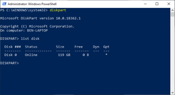 Когда Diskpart открыт, первое, что вы должны сделать, это проверить текущую разметку ваших жестких дисков и подключенного хранилища.