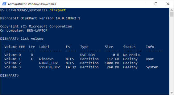 • Наряду с вашим списком дисков, вы также можете запросить у Diskpart список обнаруженных томов. В приглашении «DISKPART» введите list volume.