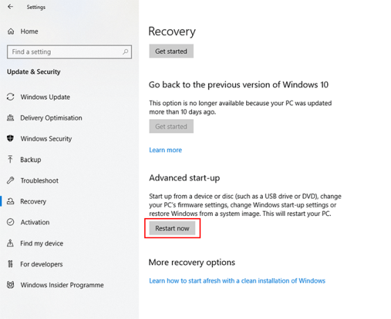• Нажмите Restart Now, чтобы загрузить WinRE.
