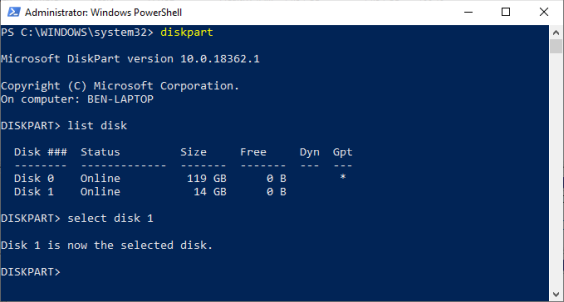 • Начните с выбора выбранного диска с помощью select disk #, заменив # на номер вашего диска (и используя list disk, чтобы найти номер диска, если вы не знаете).