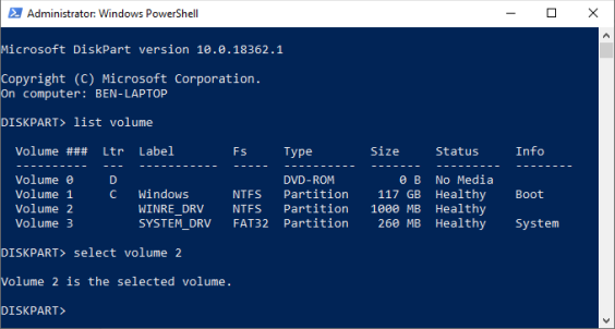 • Введите list volume, чтобы получить список всех доступных томов на вашем ПК, затем введите select volume # , заменив # на том, который вы хотите расширить.