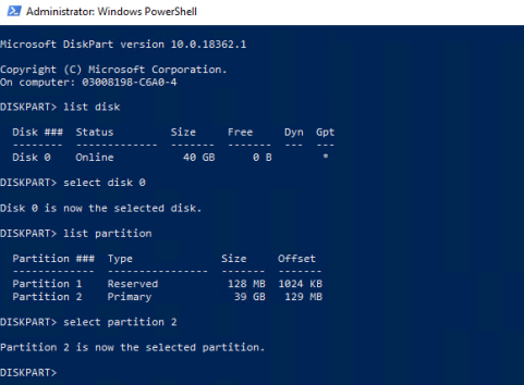 • В приглашении «DISKPART» введите раздел списка , затем выберите раздел # , заменив # номером своего раздела.
