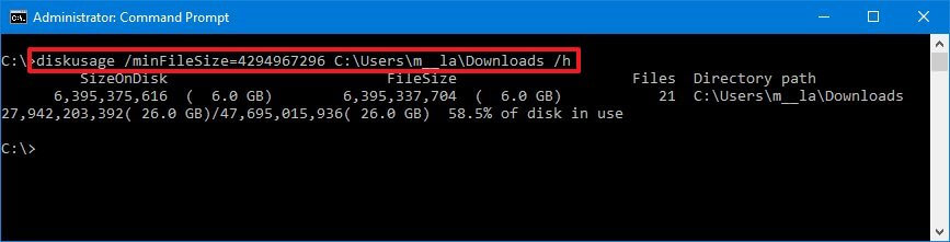 diskusage /minFileSize=4294967296 C:UsersuserDownloads /h