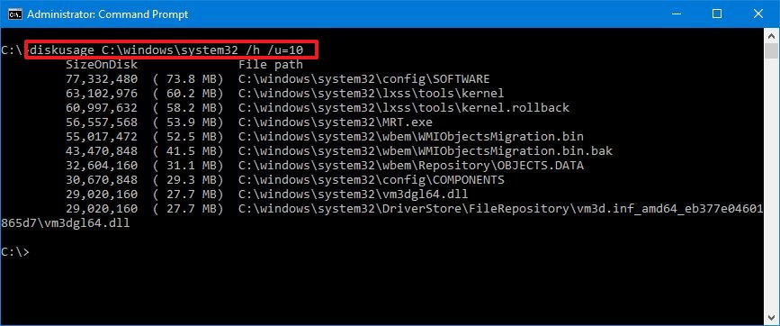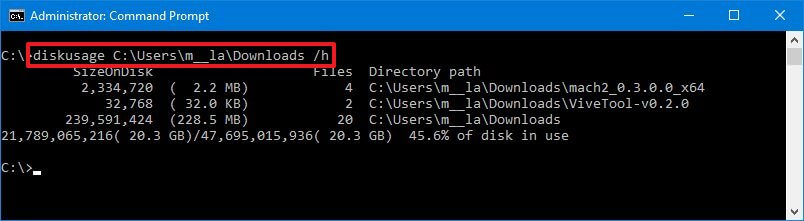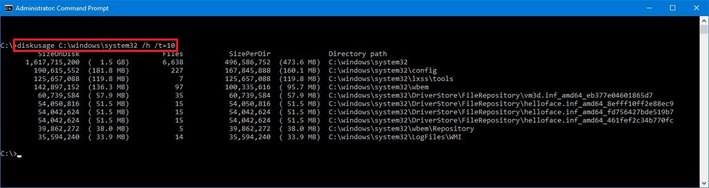 В Windows 10 DiskUsage — это инструмент командной строки, который позволяет быстро анализировать содержимое данной папки или всего накопителя, чтобы понять, как используется пространство, и выяснить, какие файлы занимают больше всего места, а какие могут войти удобно при попытке освободить место.