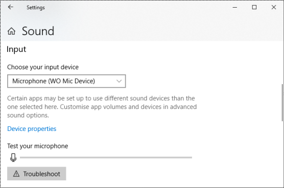 Нажмите клавишу Windows + I, чтобы открыть настройки. Перейдите в Система → Звук. Под входом используйте раскрывающийся список для выбора Микрофон (WO Mic Device).