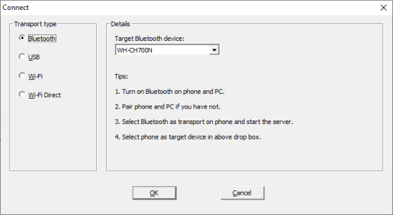 В программе Windows WO Mic выберите Bluetooth в качестве типа транспорта и выберите свой телефон в раскрывающемся списке «Целевое устройство Bluetooth». Нажмите ОК.