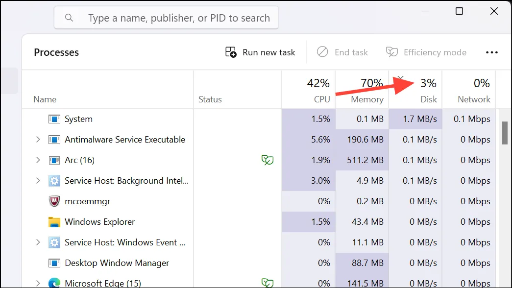- Процессы с наибольшим использованием диска переместится наверх. Определите все сторонние приложения, которые могут потреблять необычно много ресурсов, и завершите эти задачи.