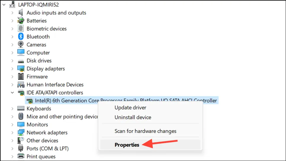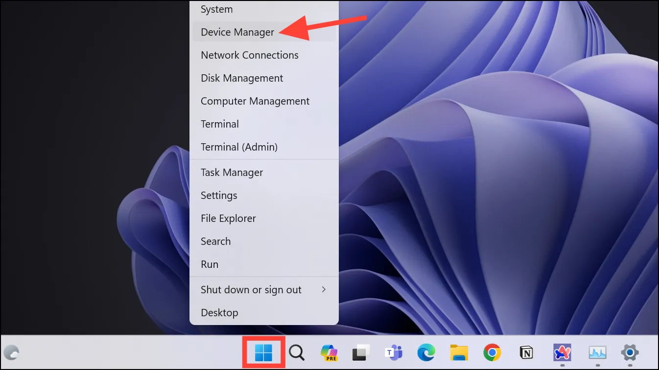 - Чтобы обновить драйверы хранилища, щелкните правой кнопкой мыши меню «Пуск» и выберите в меню «Диспетчер устройств».