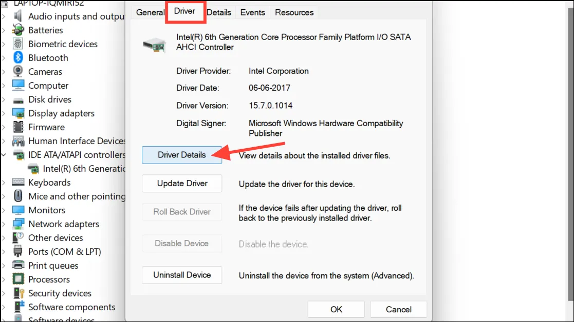 - Перейдите на вкладку «Драйвер» в диалоговом окне «Свойства» и нажмите кнопку «Сведения о драйвере».