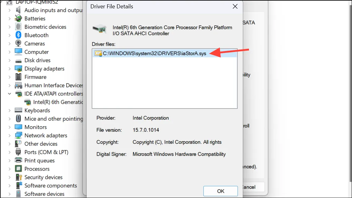 storahci.sysЕсли в названии указаны данные драйвера (у нас нет), то вам нужно двигаться дальше. Нажмите «ОК», чтобы закрыть диалоговое окно «Драйвер».