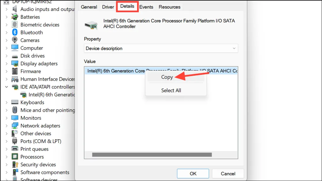 - Теперь перейдите на вкладку «Сведения» в разделе «Свойства». Затем в раскрывающемся меню переключитесь на «Путь к экземпляру устройства». Скопируйте путь и вставьте его куда-нибудь под рукой, например в Блокнот, поскольку он понадобится вам на следующем шаге. Закройте диспетчер устройств.