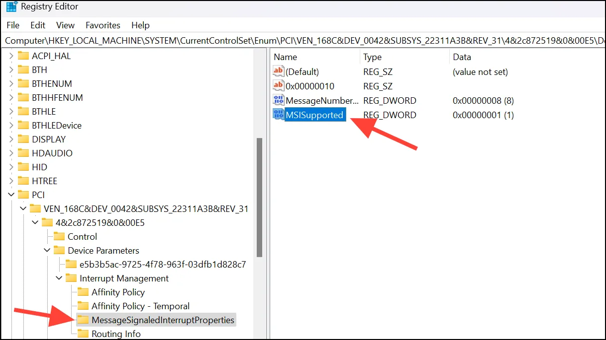 Device Parameters>Interrupt Management>MessageSignaledInterruptProperties.