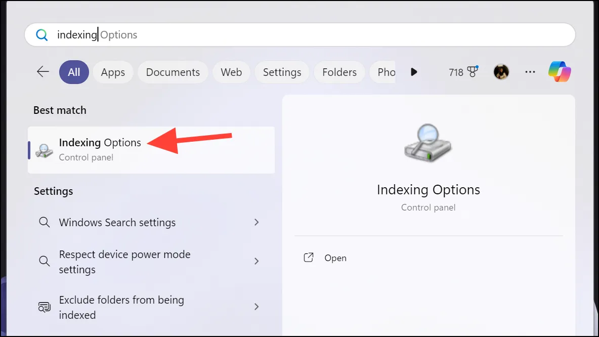 - Откройте поиск Windows, введите «Индексирование» и выберите «Параметры индексирования» в результатах поиска.