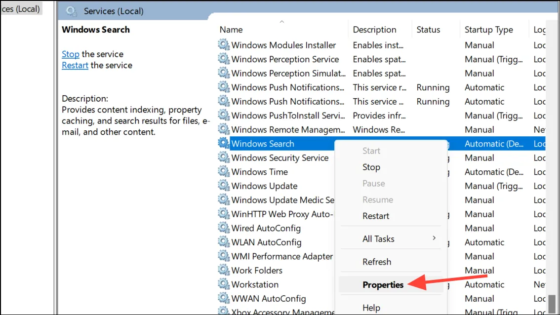 - В окне «Службы» перейдите к «Поиск Windows», щелкните его правой кнопкой мыши и выберите в меню «Свойства».