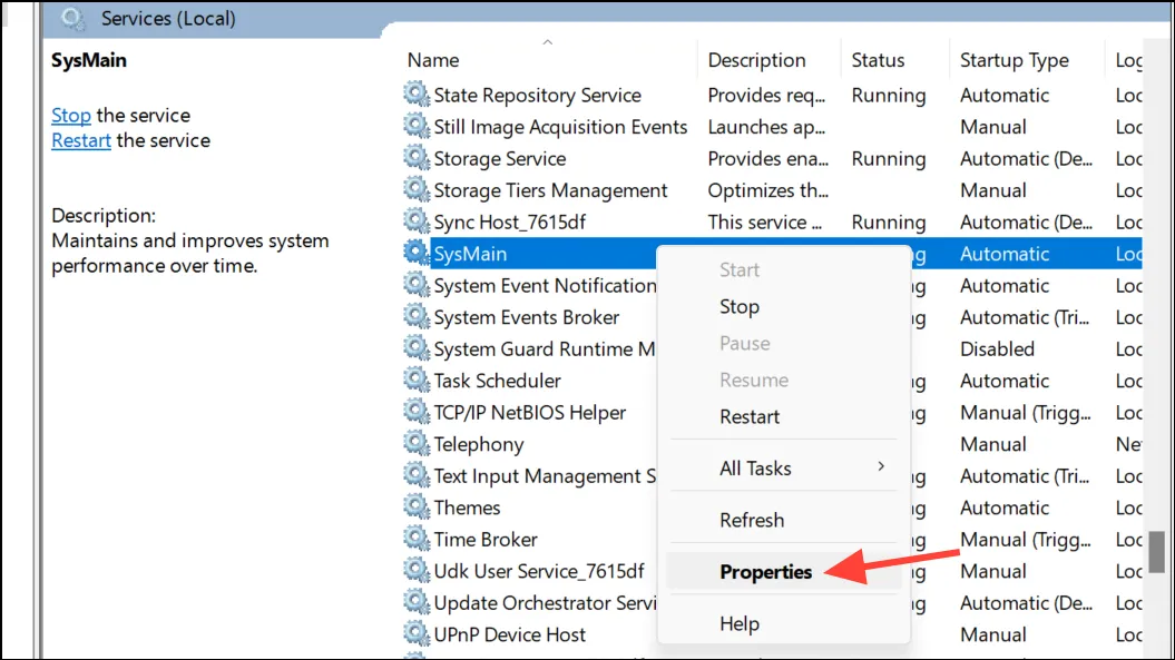 - Затем перейдите к «SysMain» на правой панели и щелкните его правой кнопкой мыши. В контекстном меню выберите «Свойства».