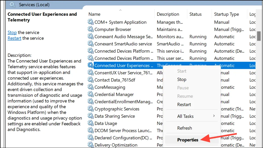 - Затем щелкните правой кнопкой мыши параметр «Взаимодействие с подключенными пользователями и телеметрия» и перейдите в «Свойства».