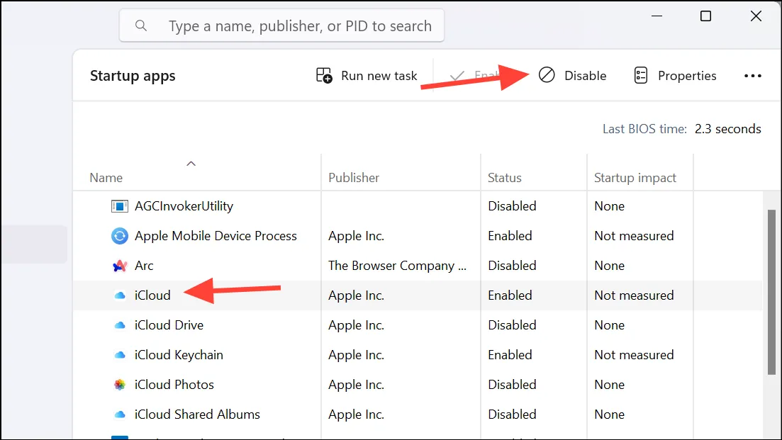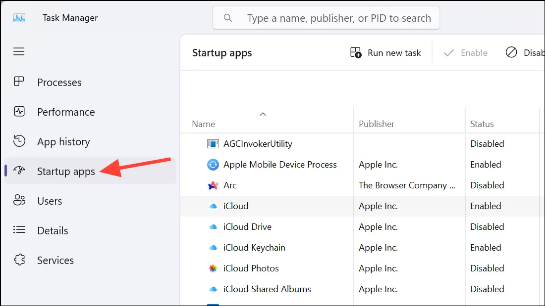 - Затем отключите все приложения, которые вам не нужны при запуске, выбрав приложение и нажав «Отключить».