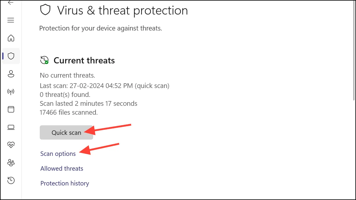 - Затем выполните быстрое или полное сканирование (предпочтительно, но занимает больше времени), чтобы обнаружить и удалить возможные вирусы. Чтобы выполнить полное сканирование, нажмите кнопку «Параметры сканирования».
