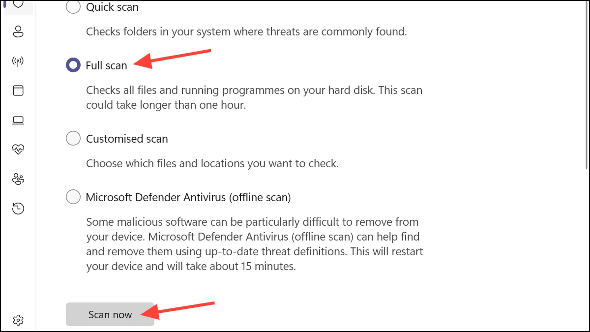 - Выберите «Полное сканирование» из вариантов и нажмите кнопку «Сканировать сейчас».
