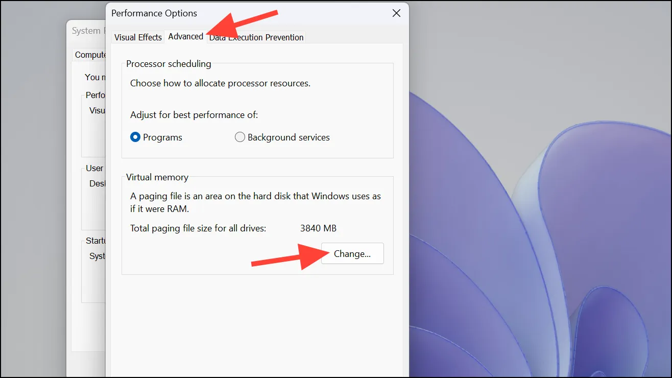 - Перейдите на вкладку «Дополнительно» и нажмите «Изменить» в разделе «Виртуальная память».
