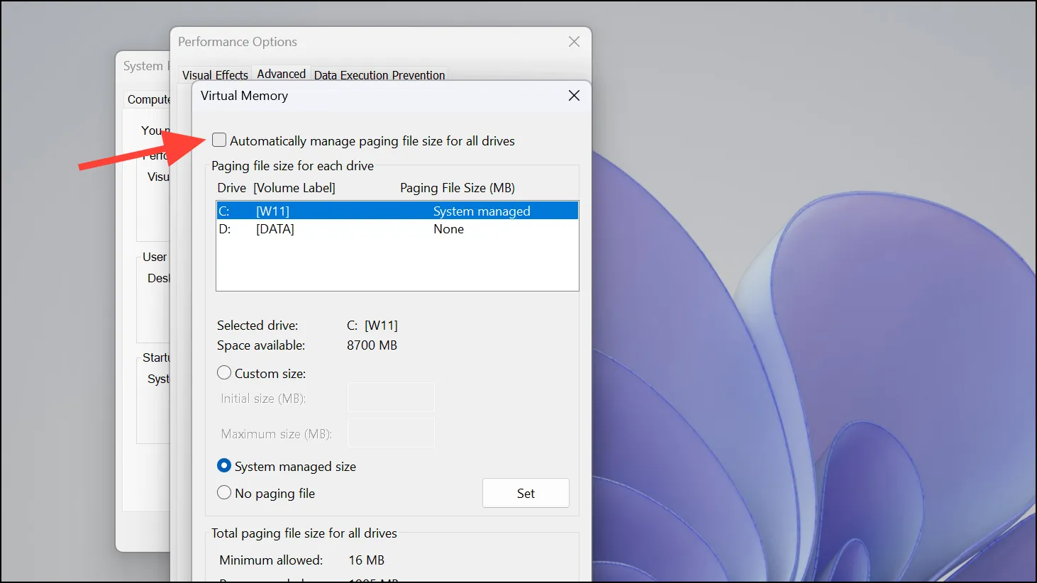 - Снимите флажок «Автоматически управлять размером файла подкачки для всех дисков».