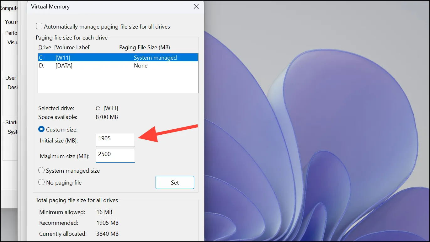 - Для максимального размера введите значение, которое не должно превышать размер вашей оперативной памяти более чем в 1,5 раза. Но вы можете ввести и меньшее значение; поскольку мы пытаемся ограничить использование диска, не делайте это число слишком большим.