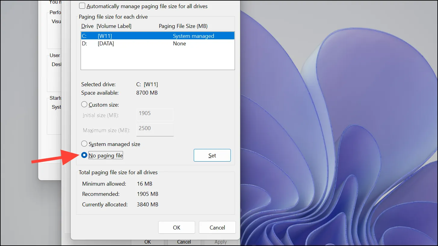 - Вы также можете выбрать «Без файла подкачки», если вообще не хотите выделять виртуальную память с вашего диска.