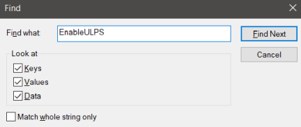 Поиск раздела реестра EnableULPS может занять некоторое время. Как только оно появится, дважды щелкните значение EnableULPS и измените его с 1 на 0.