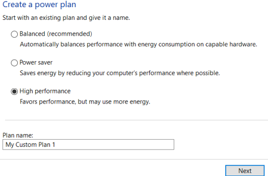 - Выберите «Высокая производительность» и нажмите «Далее». Выберите настройки сна и нажмите «Создать».