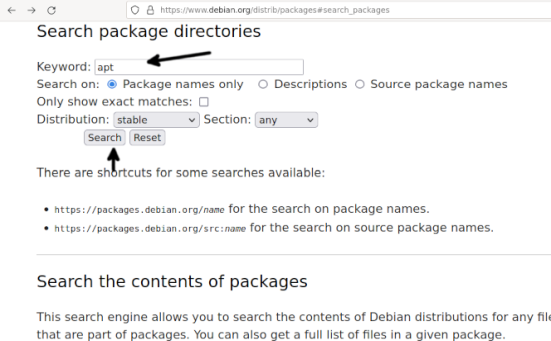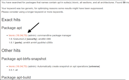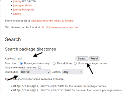 Введите apt в поле ключевого слова, выберите правильный выпуск Ubuntu и нажмите кнопку «Поиск», как указано стрелками на снимке экрана ниже.
