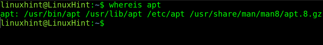 Чтобы подтвердить это, сначала проверьте, где находится двоичный файл apt. Вы можете использовать команду whereis, как показано в следующем примере.