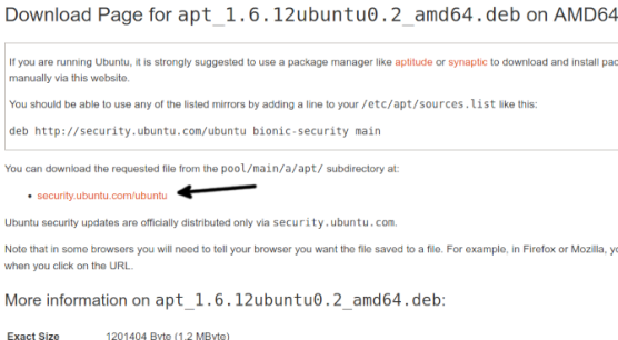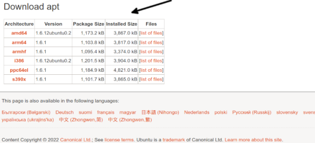 Прокрутите начальную страницу вниз и нажмите ссылку на пакет apt, как показано на следующем рисунке.