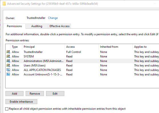 В левом списке записей реестра щелкните правой кнопкой мыши CLSID, относящийся к ошибке, затем выберите Разрешение → Дополнительно. Отсюда вы можете редактировать разрешения службы.