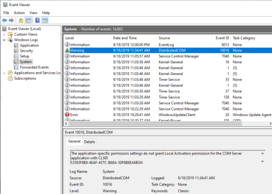 Перейдите в « Журналы Windows» → «Система» и найдите последнюю ошибку DCOM 10016. Дважды щелкните сообщение об ошибке, чтобы развернуть его.