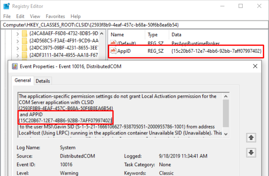 Сначала выделите CLSID в средстве просмотра событий, затем нажмите CTRL + C, чтобы скопировать. Затем откройте редактор реестра . Поиск в реестре для следующего: