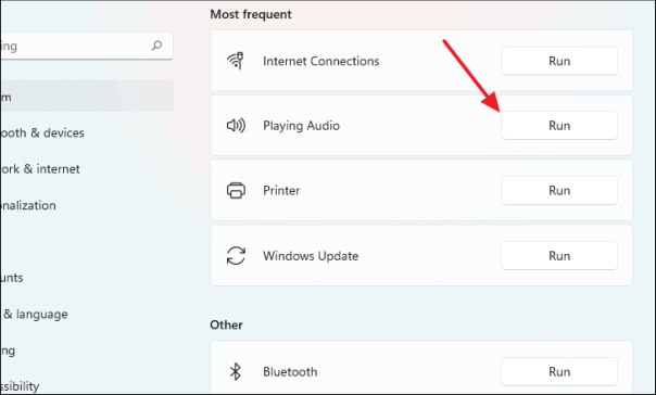 Вам будет представлен список средств устранения неполадок для различных случаев. Нажмите кнопку «Выполнить» рядом с «Воспроизведение аудио» в разделе «Наиболее частые».