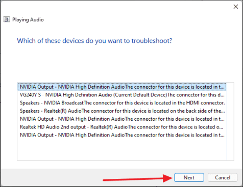 После этого вам будет предложено выбрать аудиоустройство, которое вы хотите устранить. Здесь выберите активное аудиоустройство или драйвер, выделив его, а затем нажмите «Далее».