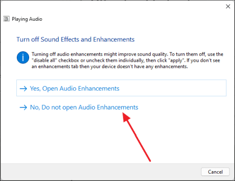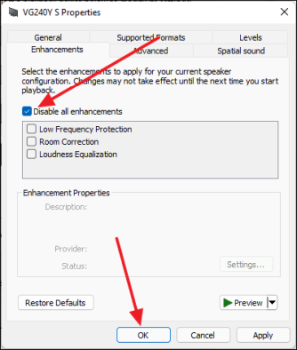 «Отключить все улучшения» рядом с ним и нажмите «ОК», чтобы сохранить изменения.