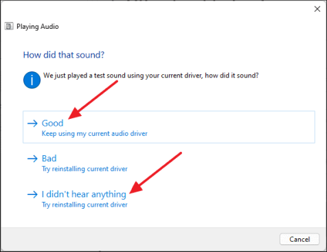 Если вы слышите звук каждый раз, значит, проблема устранена. В этом случае нажмите ОК «Хорошо» и закройте средство устранения неполадок. Но если вы по-прежнему не слышите звука, выберите «Я ничего не слышал».