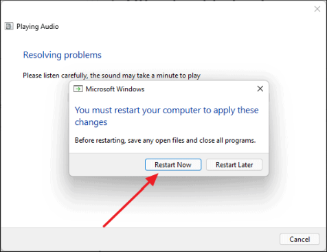 После того, как вы нажмете «Я ничего не слышал», средство устранения неполадок автоматически переустановит аудиодрайвер, и появится диалоговое окно с просьбой перезагрузить компьютер. Нажмите «Перезагрузить сейчас», и проблема будет устранена после перезагрузки компьютера.