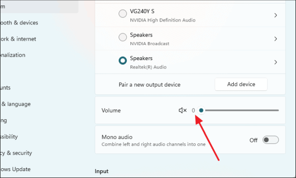 Если в строке «Громкость» вы видите «0» перед ползунком громкости, это означает, что звук в настоящее время отключен.