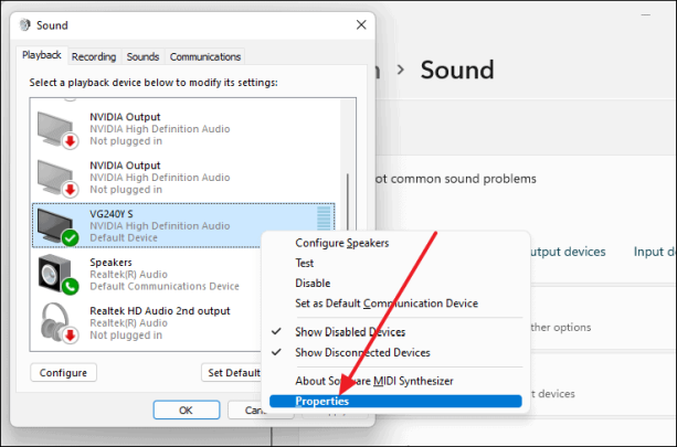 Появится новое окно под названием звук. Там, на вкладке «Воспроизведение», будут перечислены все активные и неактивные аудиоустройства. Оттуда щелкните правой кнопкой мыши аудиодрайвер, который используется в данный момент. После щелчка правой кнопкой мыши появится меню, в котором выберите «Свойства».