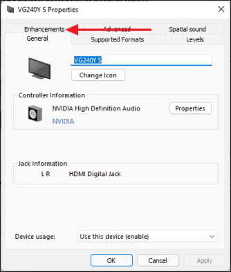 Когда откроется окно «Свойства», переключитесь на вкладку «Улучшения», щелкнув по ней один раз.