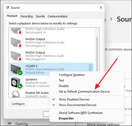 Появится окно с надписью «Звук». Оттуда щелкните правой кнопкой мыши аудиоустройство, которое вы используете в настоящее время, из списка аудиоустройств и выберите параметр «Установить как устройство связи по умолчанию».