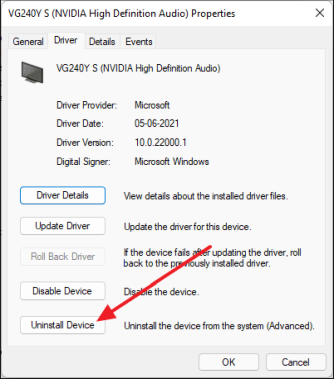 В окне «Свойства». перейдите на вкладку «Драйвер» и нажмите «Удалить устройство».